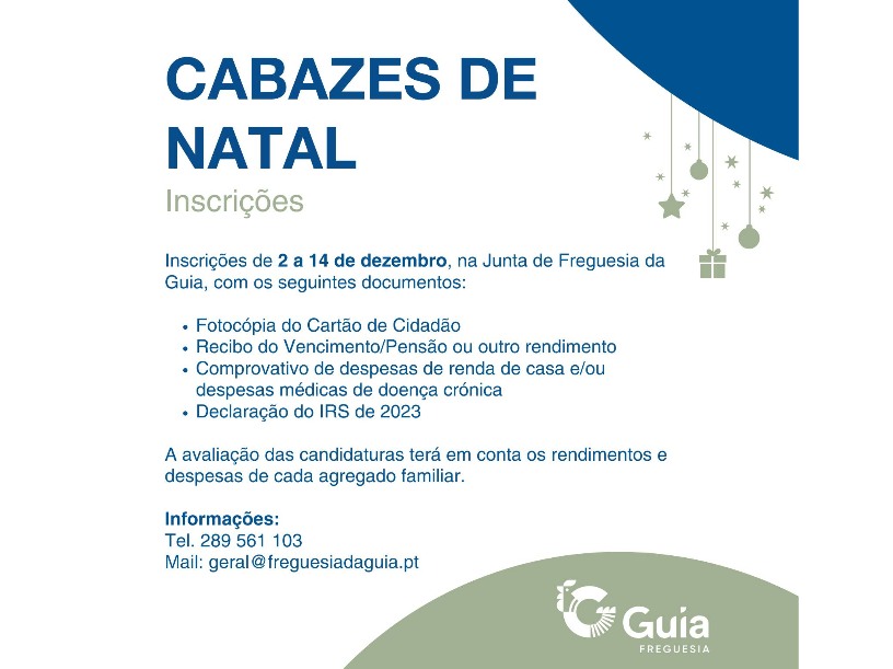 A Junta de Freguesia informa todos os residentes que as inscrições para o Cabaz de Natal para as famílias carenciadas irão decorrer entre os dias 2 e 14 de dezembro.